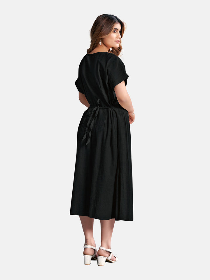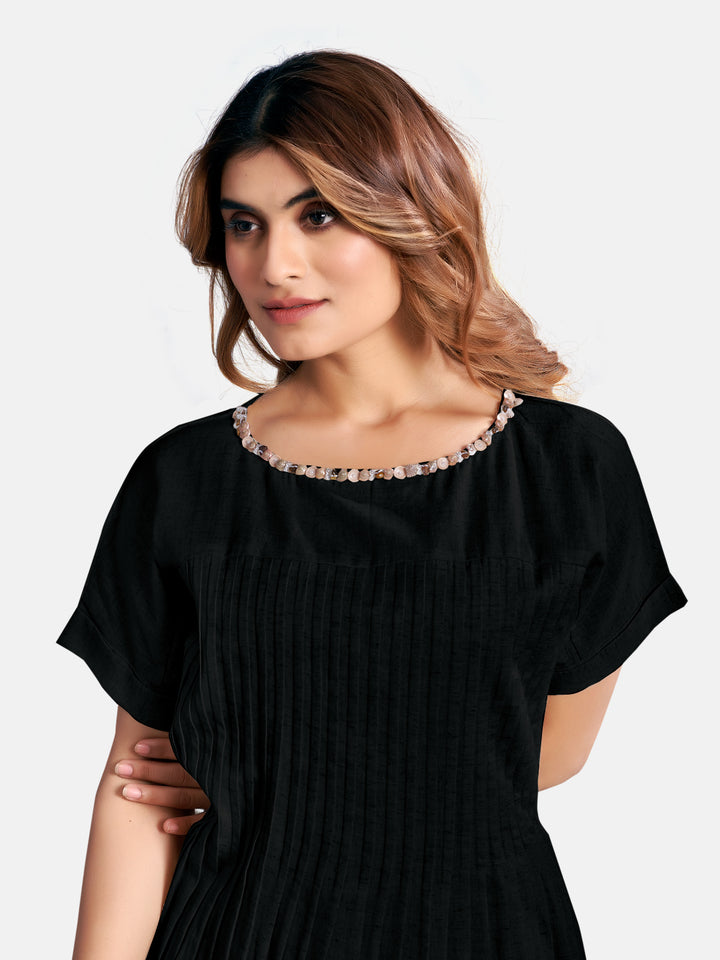 Elegant Cotton Flex Front Pin Tucks Hand Embellished Boat Neck Kimono Style With Handy Pocket Dress - Black