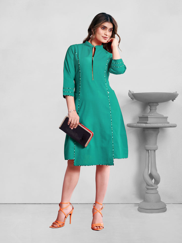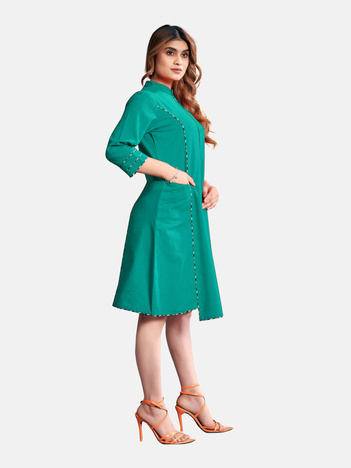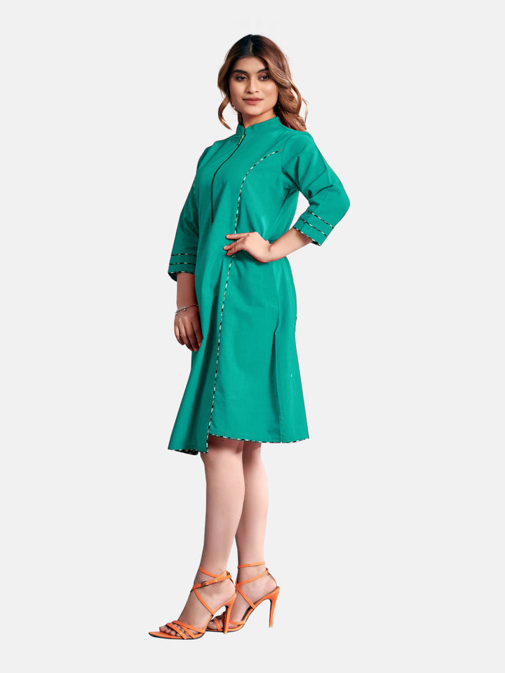 Casual Cotton Slub A-Line 3/4Th Sleeve Front Zipper Opening Cord Piping Stylized Dress - Sea Green