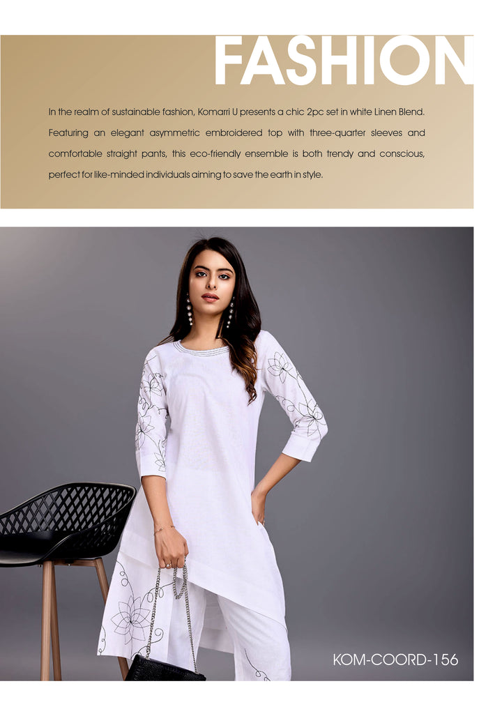 elegant asymmetric embroidered three forth sleeves top with a comfortable embroidered comfortable stright pants set in Linen Blend - White