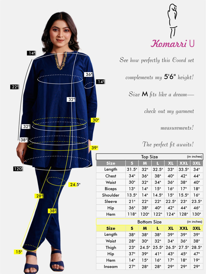 Elegant Khadi Cotton Full Sleeves V Neck Flared Top With Embellished Neckline & Straight Pants With Curvy Hem Set - Navy Blue