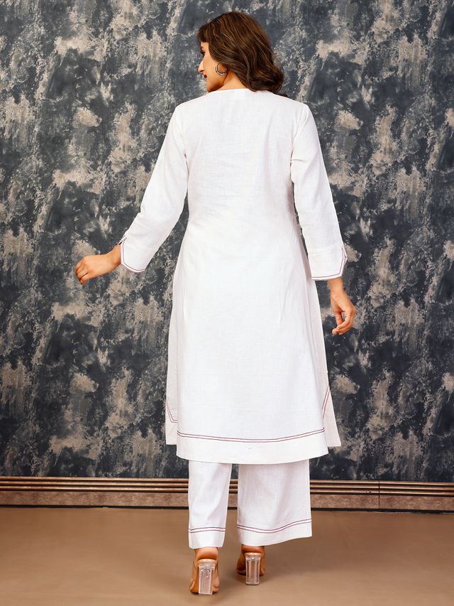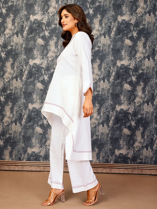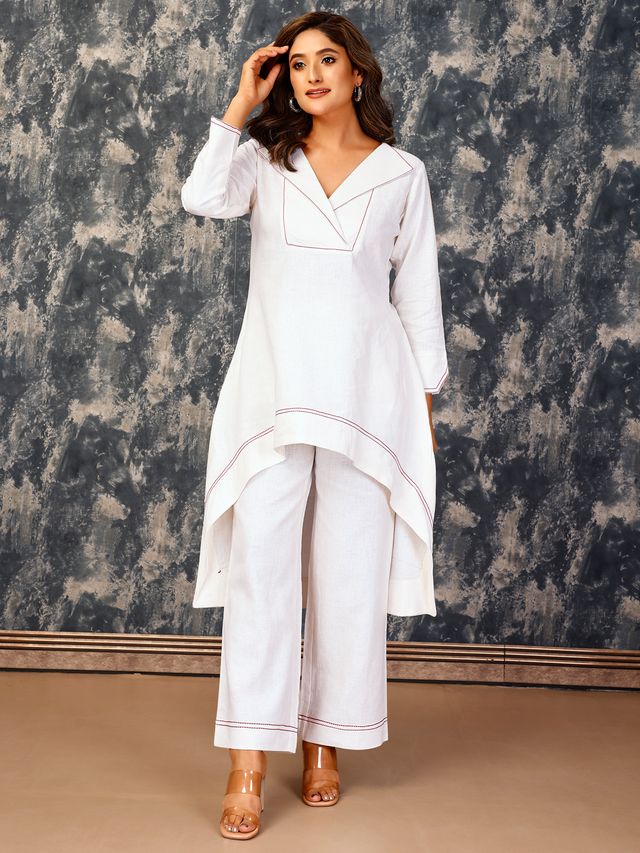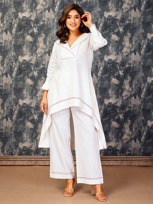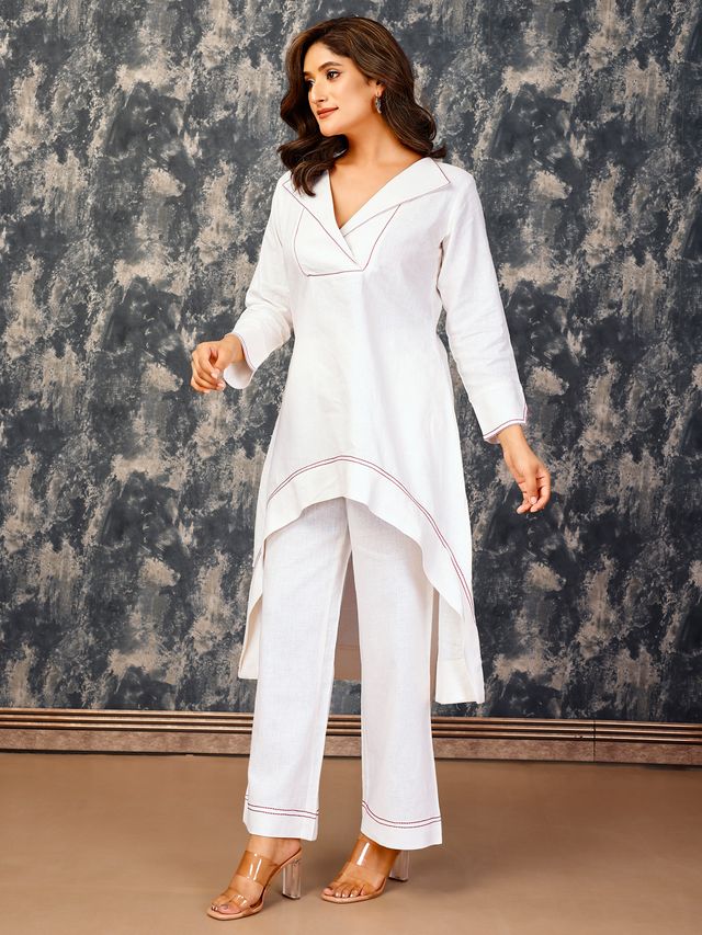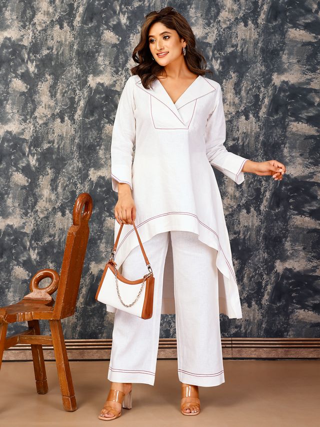 elegant overlapped V neck lapel collared, open cuff sleeves Asymmetric top with trousers in Linen Cotton set - White