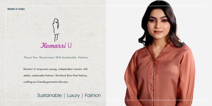 Elegant Viscose Crepe Hand Embellished Ruffled V-Neck Front Placket ,3/4Th Smocking Cuff Sleeve Top - Rust
