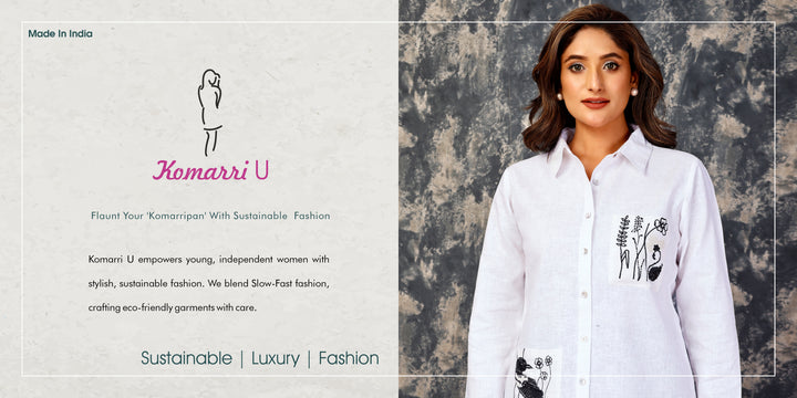 Linen shirt with tropical embroidered front pockets & cuff sleeves -White