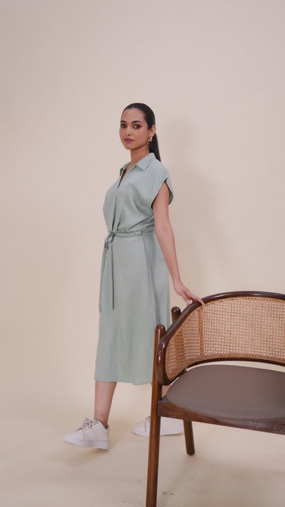 Komarri u stylish spun v-neck shirt collar kimono style waist pleated dress with braided belt.