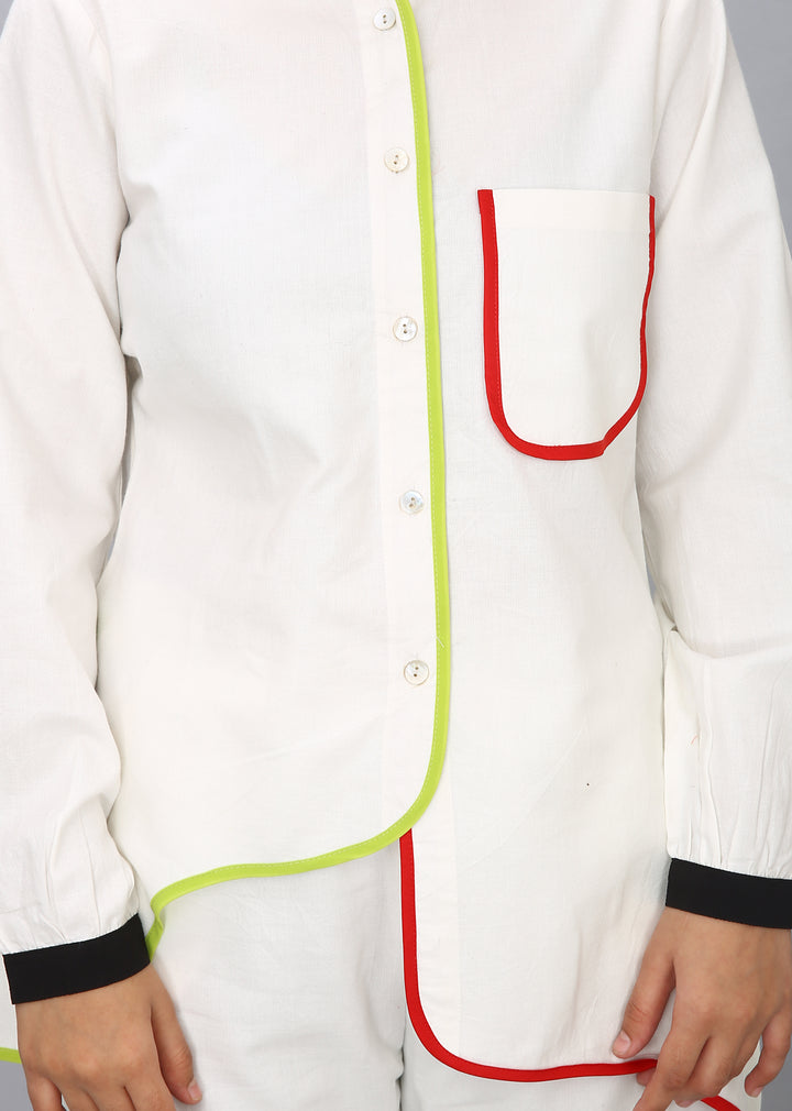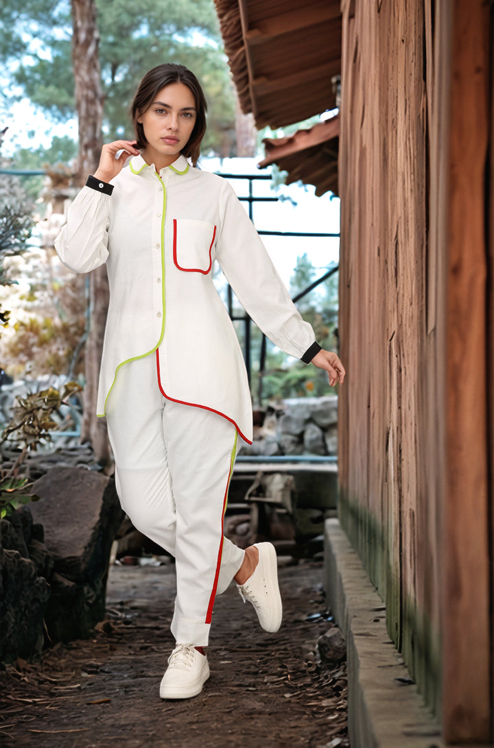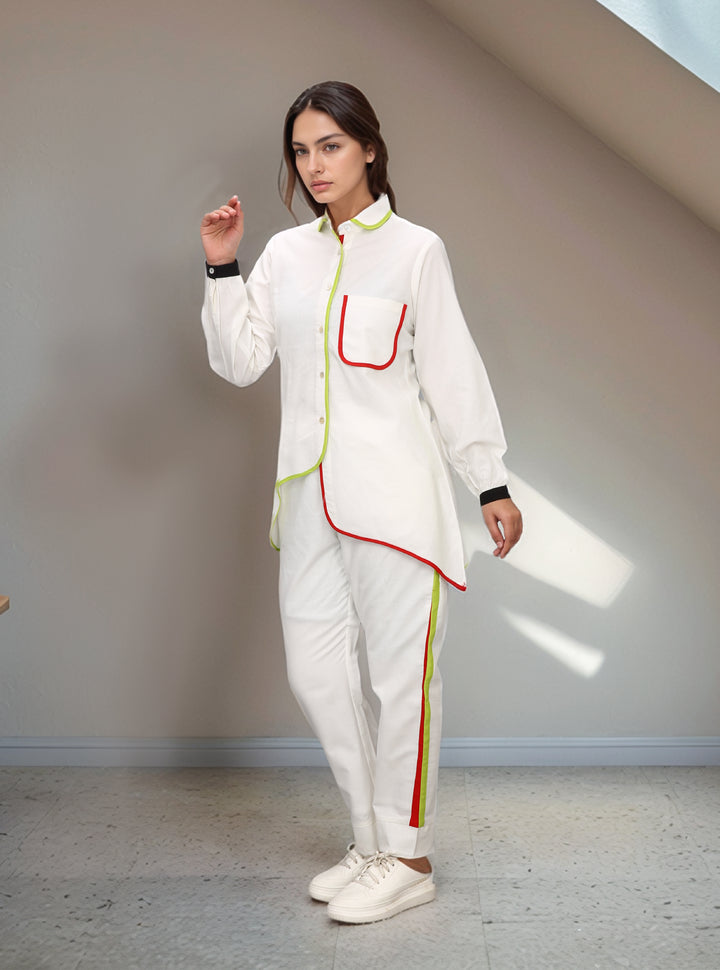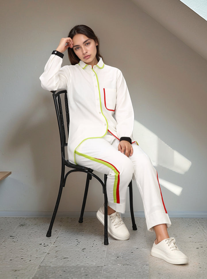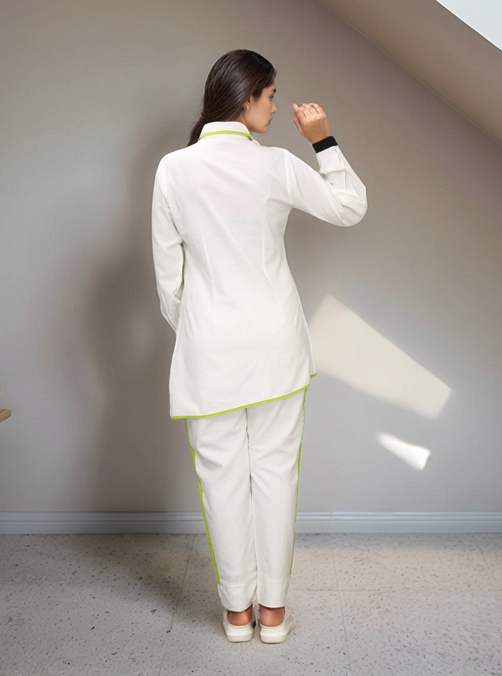 This expertly designed co-ord set features a perfectly tailored shirt paired with matching trousers, creating a cohesive and polished look. Crafted for comfort and style, the combination offers versatility for various occasions, whether professional or casual. The coordinated pieces ensure effortless styling while maintaining a sophisticated silhouette.