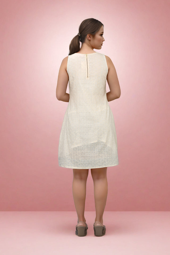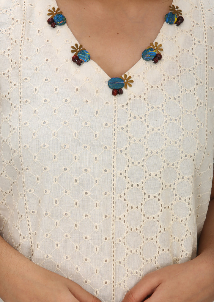 Highlights / Surface Styling / Features: modish cotton, cotton linen, tencile denim, bamboo blend, v-neck , half sleeve, statement shell embroidered, colour blocking a-line dress.